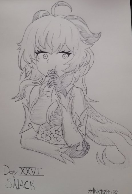 Dia 27: Snack Ganyu comiendo su aperitivo favorito: las flores Chingxin. #inktober2022 #Inktober