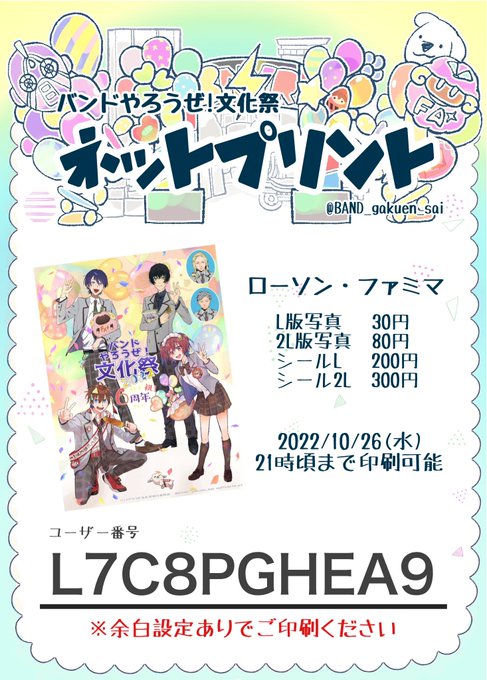 48 105 #バンドやろうぜ文化祭 の集合写真風記念イラストのネットプリントです🎊 ローソン・ファミリーマート対応 サイズや用紙はお好きなものをお選びください!印刷代のみご負担いただく形となります🙇🏻♀️ 〆10/26(水)21時までプリント可能 22/10/18 23:04