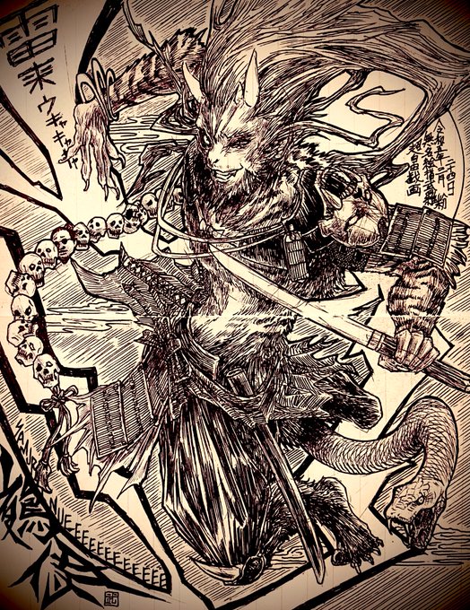 9 61 武羅粉落描きコレクション。 鵺侍です。 #イラスト #イラスト好きな人と繋がりたい #イラスト練習中 #絵描きさんと繋がりたい #落書き #ボールペン #鵺 #侍 #鵺侍 #獣人 #超自由戯画 23/03/25 01:11