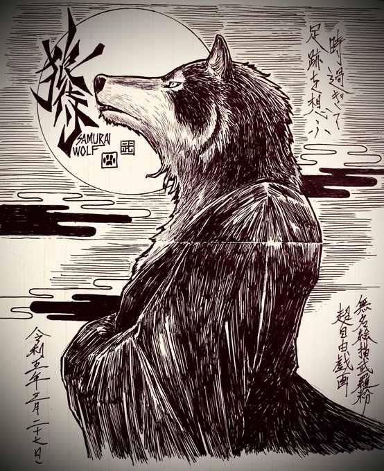185 748 狼侍です。 足跡を見よ、道だ。 と、狼侍は仰っております。 すぐ描きました。 #イラスト #イラスト好きな人と繋がりたい #イラスト練習中 #筆ペン #コピック #狼 #侍 #狼侍 #獣人 #超自由戯画 23/03/21 06:27