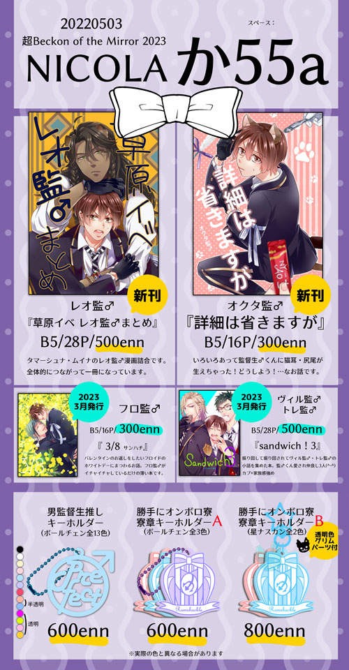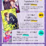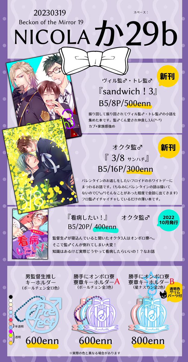 3/19 Beckon of the Mirror 19 ①『sandwich!3』ヴィル監♂・トレ監♂ 28P/500円(イベント頒布価格) 振り回して振り回されてヴィル監♂・トレ監♂の小ネタ詰め合わせ本です。 カプ+家族感強めでお送りします! とらさん委託中(先行予約受付中)→ ecs.toranoana.jp/joshi/ec/item/… #twstプラスB