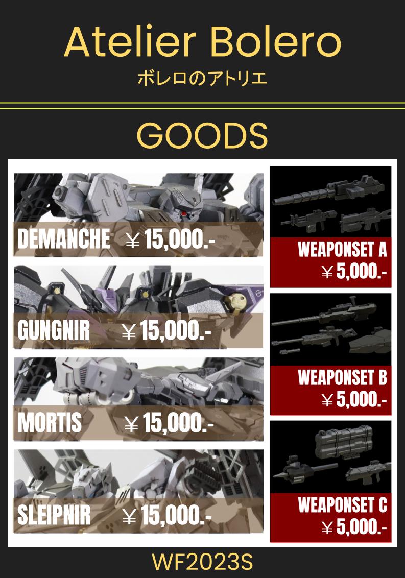 #WF2023S 販売品リストです! ※同じ商品はお一つのみお求めいただけます。 ※ボレロボ本体を購入するとお好きな武器を1つ選んで入手できるキャンペーンを行います。レア武器も交じってるかも? ボレロのアトリエは8-19-07です。 完成品の展示もありますのでぜひお越しください!