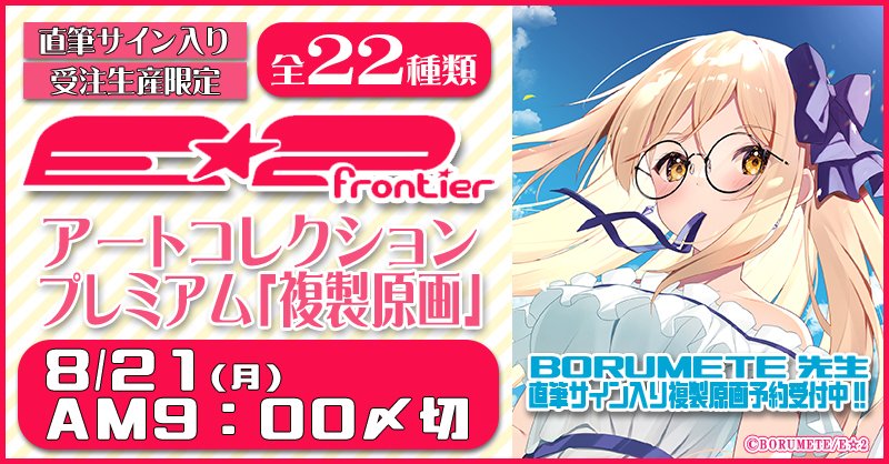 【告知】 とても嬉しいことにE☆2 frontier様で掲載させていただいたイラストが「直筆サイン入り」のグッズとなります👏👏 E☆2 アートコレクションプレミアム「複製原画」 直筆サイン付き🖊 artjeuness.jp/item/22858/ 予約〆切:8月21日(月)AM9:00 是非お手に取って下さると嬉しいですー!!!✨