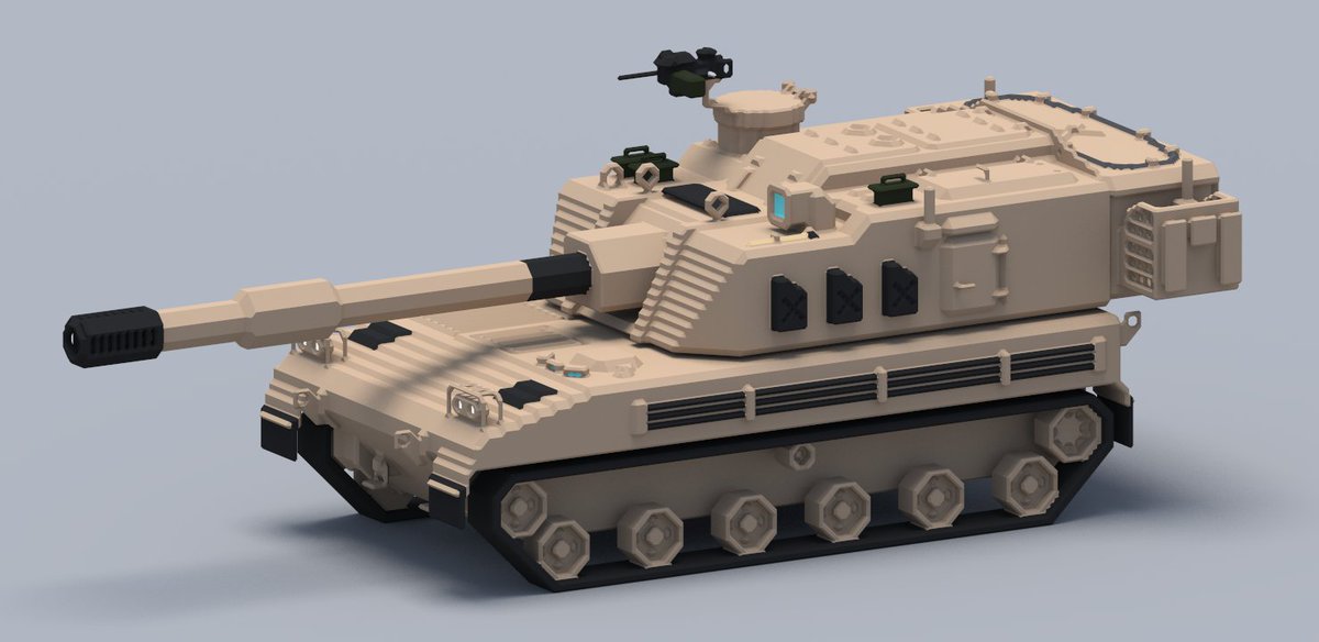 Self-propelled howitzer in voxel. Motivated from K9 Thunder and M109A6 Paladin. Made with #MagicaVoxel 0.99.6.3 Vertices: 35,875 / Edges: 55,292 / Faces: 24,548 / Tris: 24,548 #voxelart