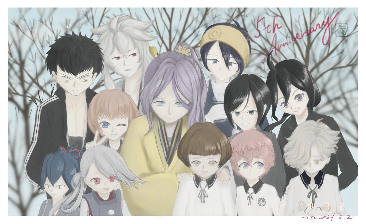 #一年間で絵が上達してるか見てみましょう ちょうどデジタルでちゃんと描き始めたのが昨年の4月だったみたい。直近描いた絵目元がないので先月頭の本丸5周年絵も載せちゃう。 絵自体が上達してるのかはわかんないけどちょっと仕上げの加工は覚えた。