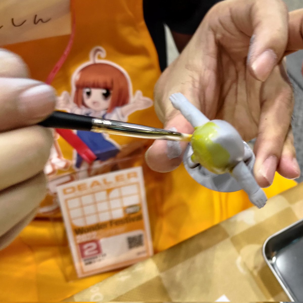 ワンフェス体験コーナー 解説その3 塗料とともに塗装用テーブルに移動して塗装開始です!わからないよ事があればどんどん聞いてください! #WF2022S #ワンフェス_カレーメシくん #秋葉原工作室