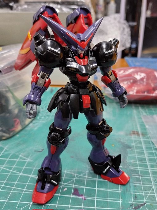 マスターガンダムの仕上げ大いに悩む-完結編。 完成>光沢塗料+スミイレ>つや消しコート>コレジャナイ感満載>光沢コートとやってまいりました。あとはパーツ注文している手首が届けば完成。 #秋葉原工作室 #ガンプラ #東方は赤く燃えている