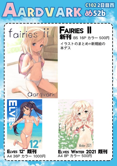 281 806 C102のおしながき的なものをつくってみました… 2日目 西め52b Aardvark 新刊はイラストまとめに新規絵を入れた感じの本となりマス… よろしくデース🟦 23/08/11 20:28