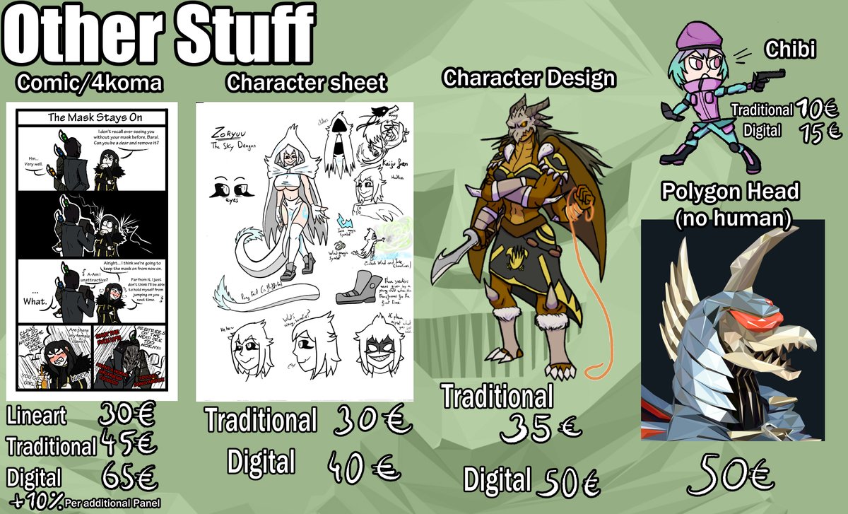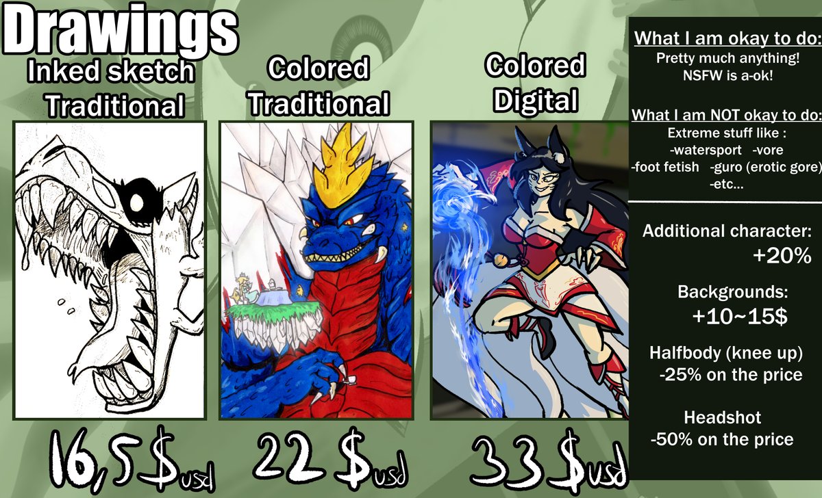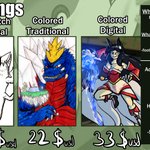 #Commission Info Thread: First: here are the new Commission sheet! lil increase in some places. Have € and $ versions because I know some are scared of non-$ sometime. I'll do pretty much anything with a ref! I will first do a quick sketch before payment. (1/7) examples below⤵️