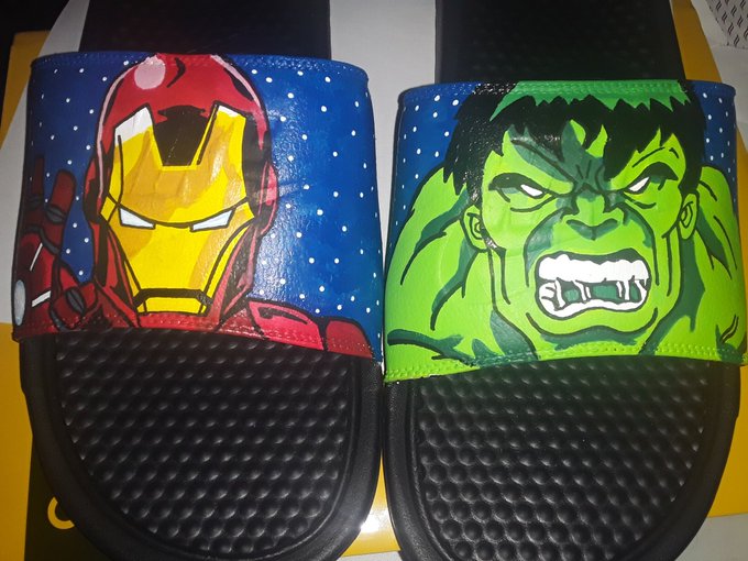 Iron Man/Hulk Custom Nike Slides #artvsartist #ArtistOnTwitter #artist #art #artwork Commissions Open Artbystinni.bigcartel.com Rugsbystinni.bigcartel.com