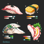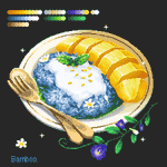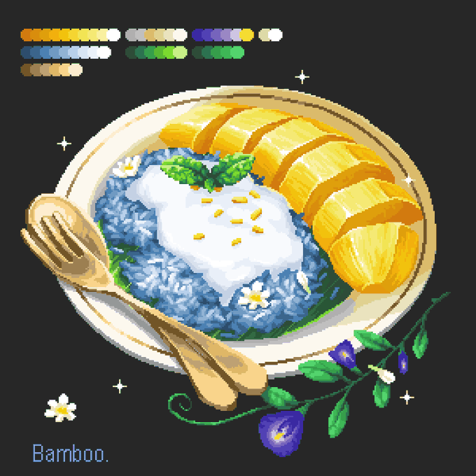 Thank you so much 5,500 followers!!! I wish you the best of happiness🎉🎉 Today I got Kao-neaw-ma-moung, or mango sticky rice, which has become highly popular in my neighborhood 🥭🍚🫒 #pixelart #ドット絵 #foodillustration