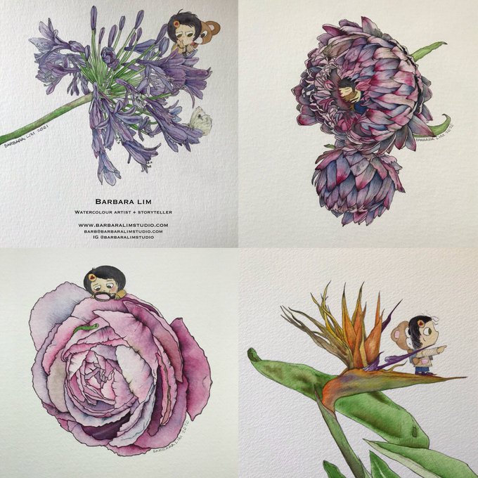 Hi #PortfolioDay My name is Barbara Lim, I'm a watercolourist based in San Francisco. Love painting flowers & food. My wee character Violet is a naturalist wannabe 💚