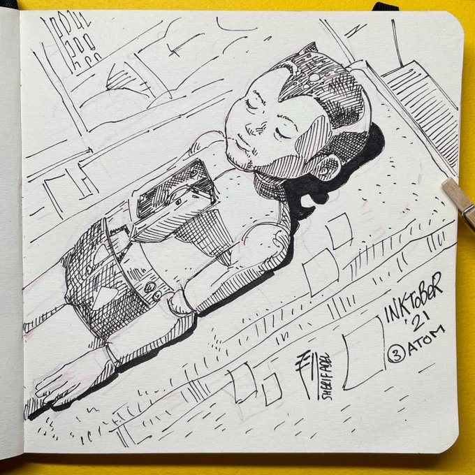 #Tokyober (3) Atom. Memorial for Osamu Tezuka in the train station of his hometown. Its a capsule with a life-sized sleeping/dead Atom (Astro boy). Saw this around 3 years ago. #inktober2021 #鉄腕アトム