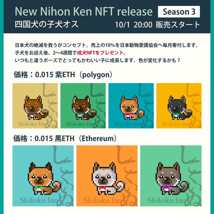 本日10/1 20:00~ 🐶日本犬NFTシーズン3🐶 四国犬子犬の1次販売がスタート💕 子犬を一定期間保護すると成犬NFTをプレゼント🎁 opensea.io/collection/nih… ✅0.015ETH ✅ホルダー様は0.012ETHでoffer可 ※紫⇒黒ETHへの変更可(DMにて) #nftart #NFTJPN