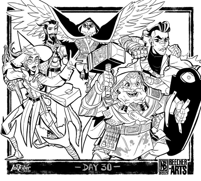 Inktober Day 30! Team S!! Here's a pic of the characters in the game I've been DMing for, for about 3 years! I suppose you could say they're mischievous? Since this was for Mischeif Night? Eh? Idk. #InktoberDay30 #Inktober2019 #DnD #DungeonsandDragons #OCs #ArtistsonTwitter