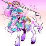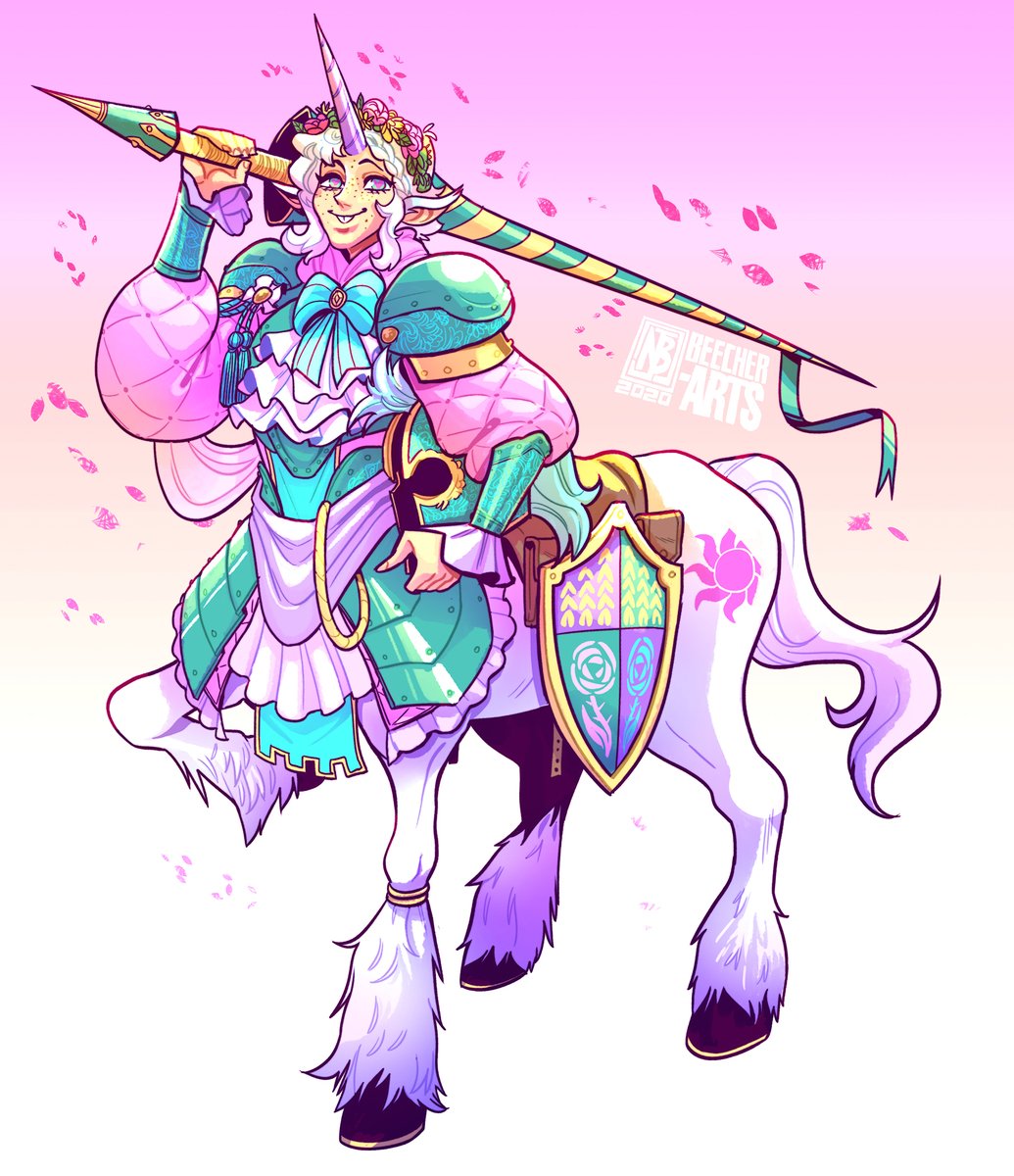 My newest D&D character, the unicorn centaur paladin: Sunbeam Sterling. A happy-go-lucky boy who is somehow a crazy-good fighter. #Unicorn #DnD #Centaur #Paladin #CharacterDesign #WotC #artistsonTwitter