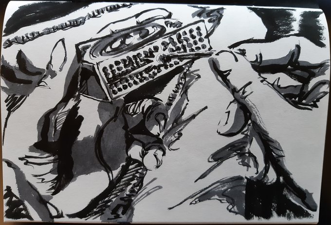 No idea what I'm drawing tonight, blaming it on the cold. #inktober #Intober2022 #inktoberday5 #guitar #soldier #brushpen