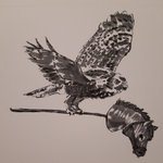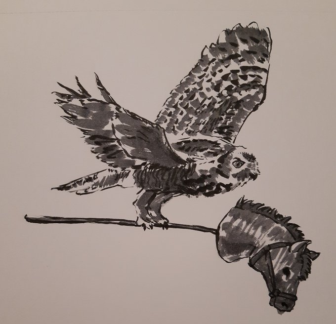 I saw a video of an owl flying with a hobby horse. #inktober #inktober2022 #inktoberday19 #owl #horse #brushpen