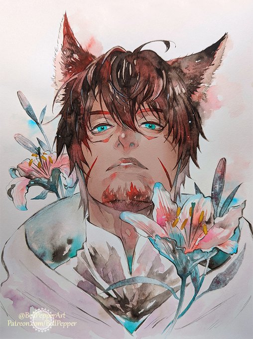 I painted Kougaon's signature striking blue walls and of course his adorable bun! This is a little gift from me to this content creator. Keep up with the great work, big sun! 🌞✨ @Kougaon_ #FFXIVART #watercolor