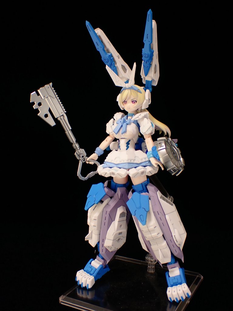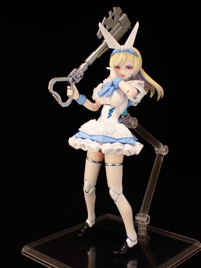 メガミデバイス Chaos & Pretty アリス完成しました!アリス本体の青はラスキウスアウラ空色で統一、ニーソックスは白、靴は黒でディ●ニーのアリスのイメージに近づけました。露出度も下がってとてもケンゼン!ウサギは逆に青をスカイブルーにして濃度を上げてみました。 #メガミデバイス