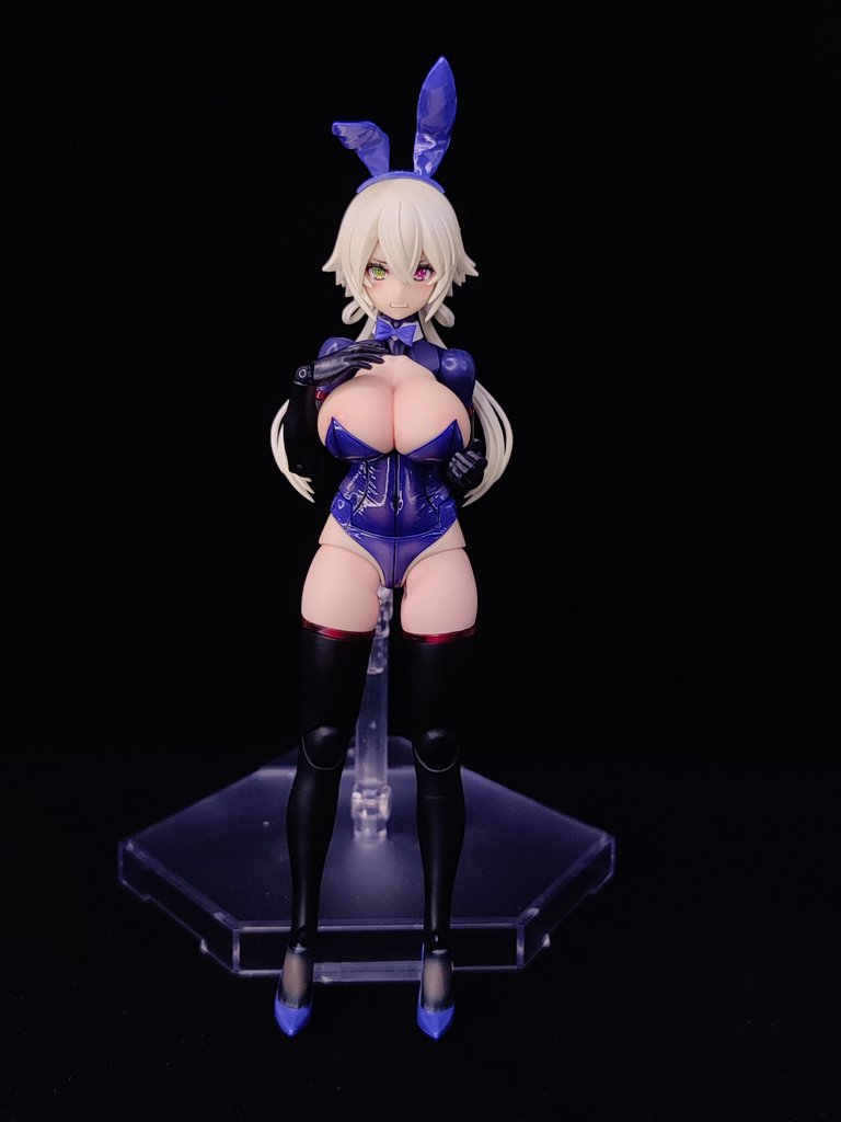 ヴェルルッタやっと完成! 紺色のパーツは布や革・金属と思われる箇所ごとに色味やグラデーションの変色、質感を変えて単調に見えないことを意識しました。素体は肌色部分増えてないのに露出度上がってるように見えたらいいな。 素組状態の完成度がバリ高いキットだと思います🤤 #アルカナディア