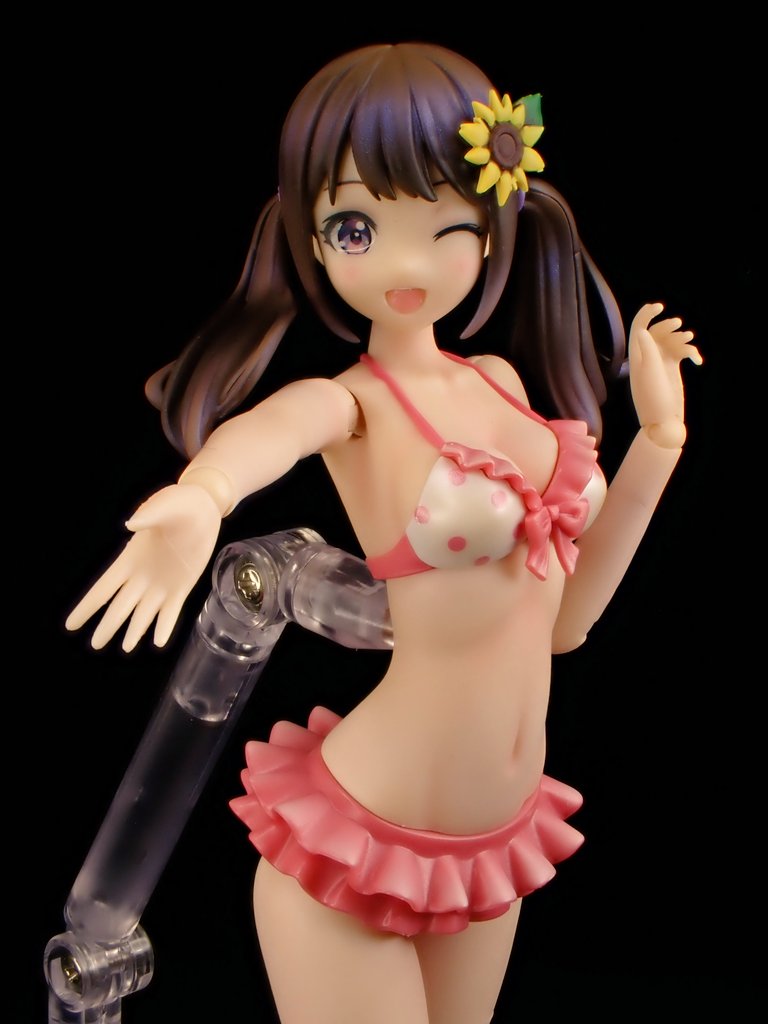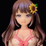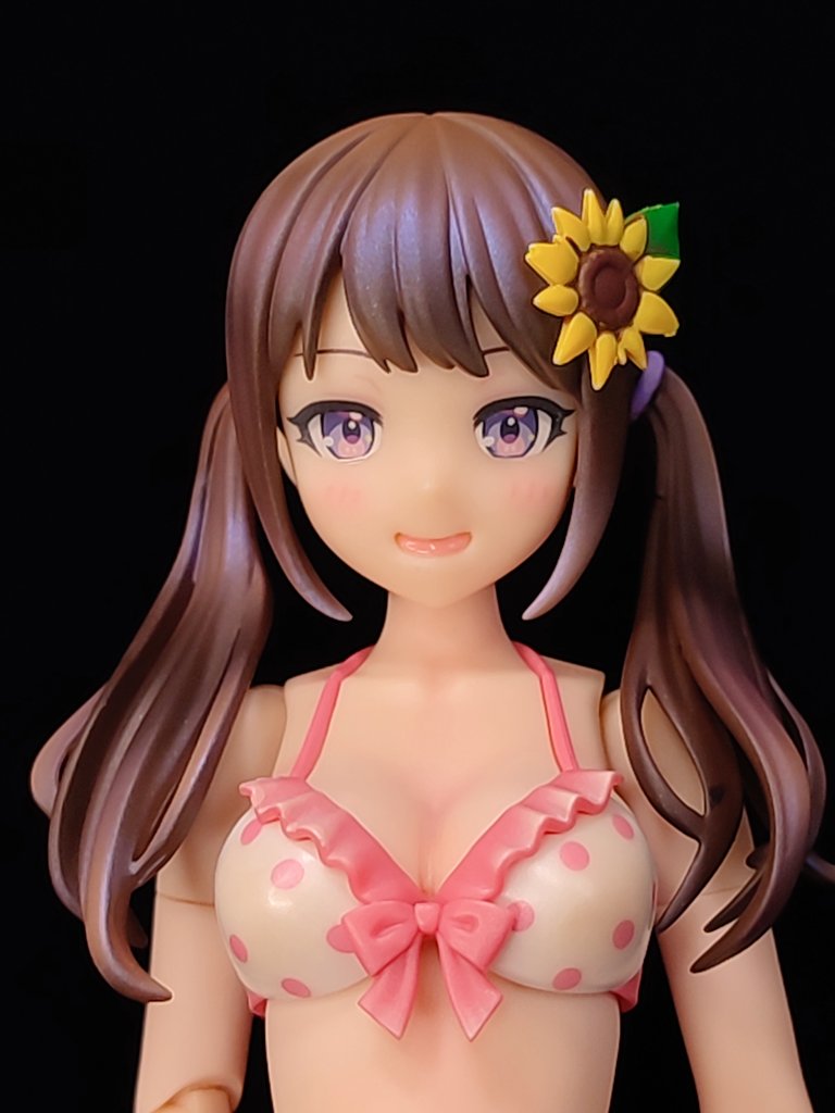 結城 まどか【水着】、完成しました。肌は合わせ目消してサフレス塗装、その他は全塗装。水着は白が浮いてるように思えたので、軽くクリアオレンジで周りの肌色が反射してるイメージに。髪の毛はグラデ+ハイライトにだけ偏光パールを入れてイラストに近づくようにしてみました。 #創彩少女庭園