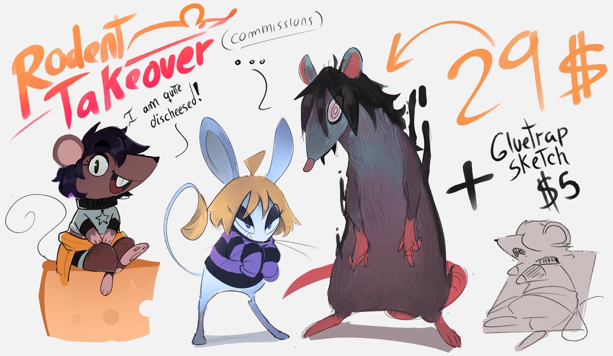It's april so I'm finally opening commissions...RODENT COMMS. Only for $29 i'll turn your OC or favorite character into a funny rodent :3