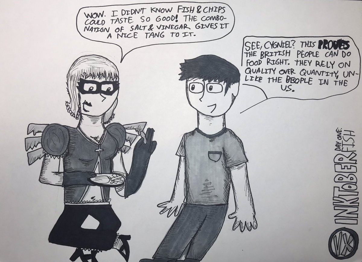 I’ve decided to not just do OC_tober, but also this year’s Inktober, too. Day 1: Fish. Enrique decided to give Cygniel a plate of fish and chips. It’s her first time trying it. #Inktober #inktober2020day1 #Inktober2020