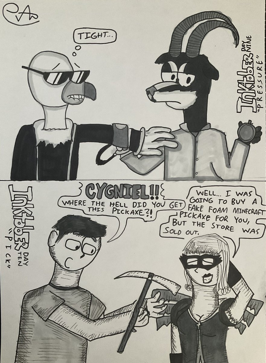 #Inktober2020 Days 9 and 10: “Pressure” and “Pick” Vulture X goes to a doctor and gets his blood pressure checked. Enrique is surprised that Cygniel bought him a real pickaxe and NOT a fake foam Minecraft pickaxe like he said. #Inktober #art #drawing #artwork #drawingoftheday