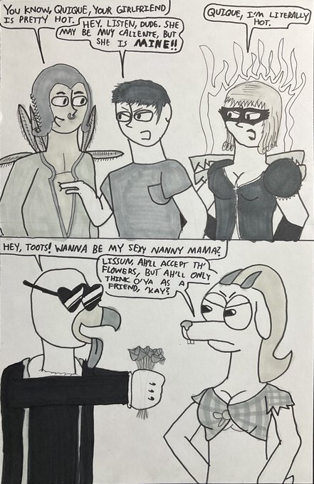 #Inktober2022 Days 5 and 6: Flame & Bouquet Påfugelantes gets scolded by Quique to stay away from Cygniel Vulture gives Nancy a bouquet of red roses, only for him to get friendzoned #inktober #art #drawing #artwork #drawingoftheday #flame #bouquet