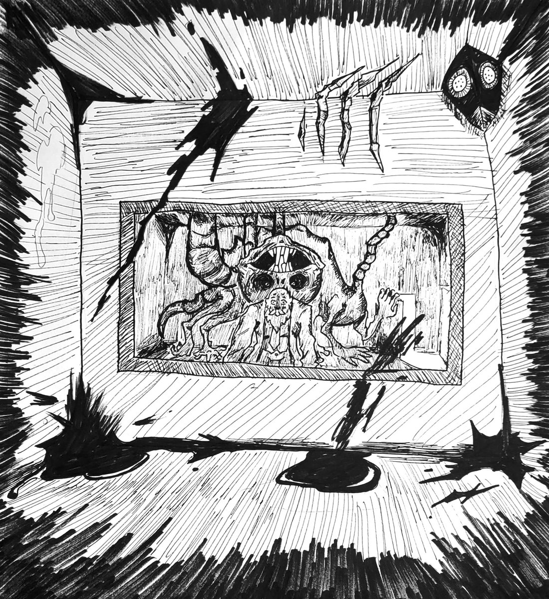 Day 14: Alarms blared throughout the facility, there had been a breach and when the head researcher had checked the specimens cell, He'd wished he hadn't arrived to find it empty #inktober2022 #inktoberday14 #inktober2022empty #inktoberempty