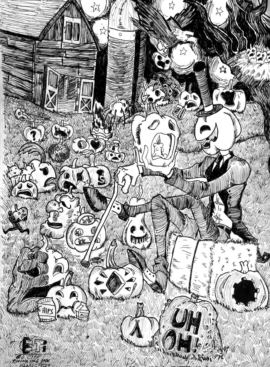 Smiling Jack donned a wicked grin as he looked across his patch. Another year of artists tending to the batch. With the hallowed seeds now planted and fears all running high. Smiling Jack laughed out loud, Hid army's birth was nigh. #inktober2022 #inktober2022day31 #inktoberfarm