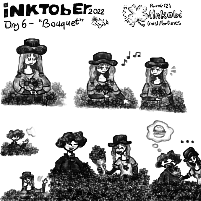 Inktober 2022 - Day 6 "Bouquete" I guess there's some deep lore to explain this... (⊙_⊙;) Also props to @Paczek_12 for designing Hakobi, she's such a cool character! q(*゚▽゚* )p #Inktober #inktober2022 #inktober2022day6 #inktoberBouquet