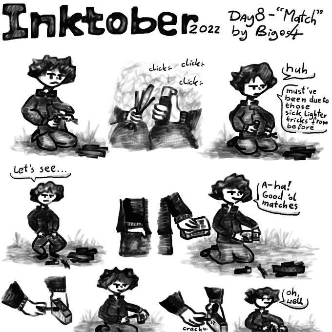 Inktober 2022, Day 8 - "Match" It seems like those totally awesome lighter tricks come at a price. Hopefully Zack has a last trick up his sleeve (⌐■_■)ノ🔥 #inktober2022 #Inktober #inktobermatch #Inktoberday8 #inktober2022day8