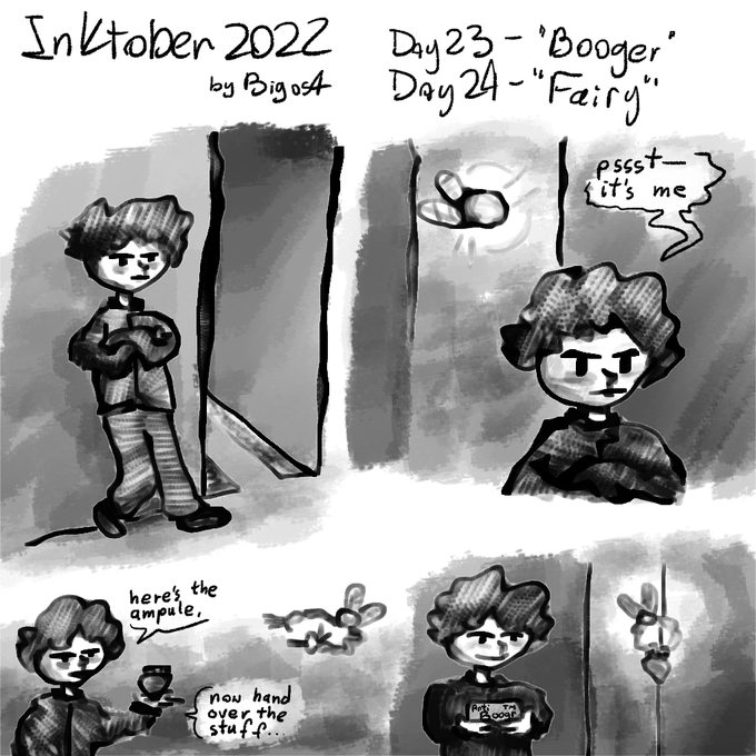 Inktober 2022 - Day 23 "Booger", Day 24 "Fairy" Remember kids, don't buy magic anti-booger fairy dust in the shady alley... Especially from those buff fairies. They're freaky!('゜—゜) #inktober2022 #Inktober #inktoberday23 #inktober2022day24