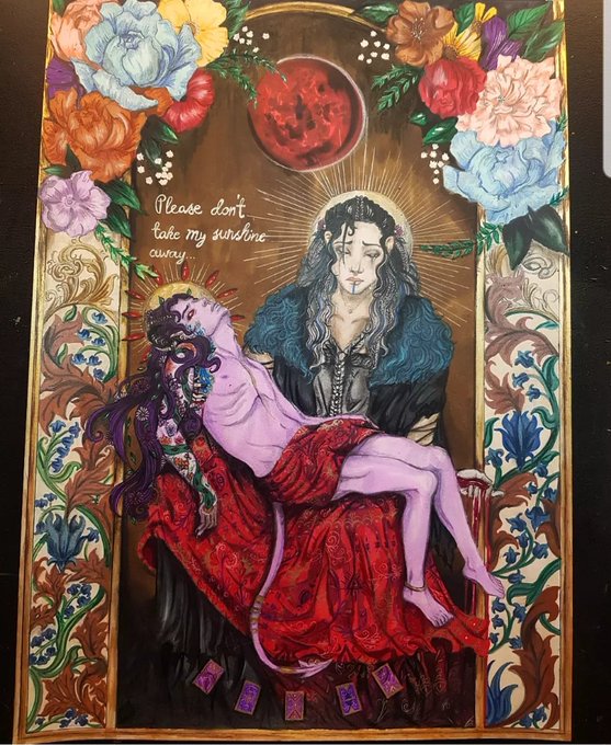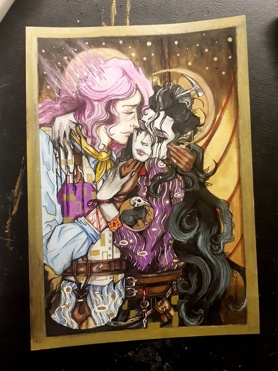 Finished my newest interpretation of Klimts painting the kiss this time featuring Laduna and Imogen from bells hells. This piece is also very inspired by @itsginnydi "Laudnas Lullaby" #CriticalRoleSpoilers #criticalrolefanart #CriticalRoleArt #BellsHells