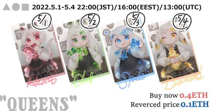 【▲⚫︎■ ひとりトランプ祭】 ♥️♣️♠️♦️"Queen" 2022.5/1~5/4、日本時間22:00 に1枚ずつlistいたします。 ・"buy now"&”reserved price 0.1ETH" (ガス代によっては"reserved price"のみ) #NFTartist #nftcollector #NFTdrop #NFTCommunity 【コレクション】 ➡foundation.app/collection/que…