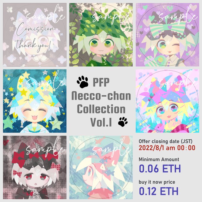 【PFP NECCO-CHAN】 オファー受付開始いたします✨ ERC-721規格(独自コントラクト) 全て手描きのPFPコレクションとなります🐱🐱 【URL】 opensea.io/collection/pfp… 🍏オファー〆切→8/1 0:00(JST) 🍎最低金額 0.06ETH 🍊即決金額 0.12ETH ※即決金額が入った時点で終了します。 #NFT #nftart