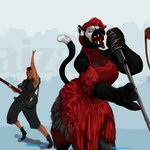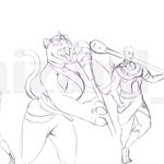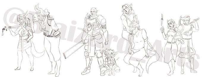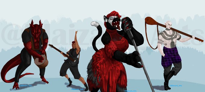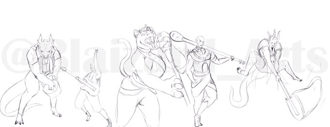 some more progress for the gray scale. so far the members are a Dragonborn Percussionist, a Dwarf Bassist, a Tabaxi (or Leonin) Singer, a Shadar-Kai Elf on Strings. with an additional Tiefling guitarist. Still trying to think of a good name for them. #dndart #characterdesign