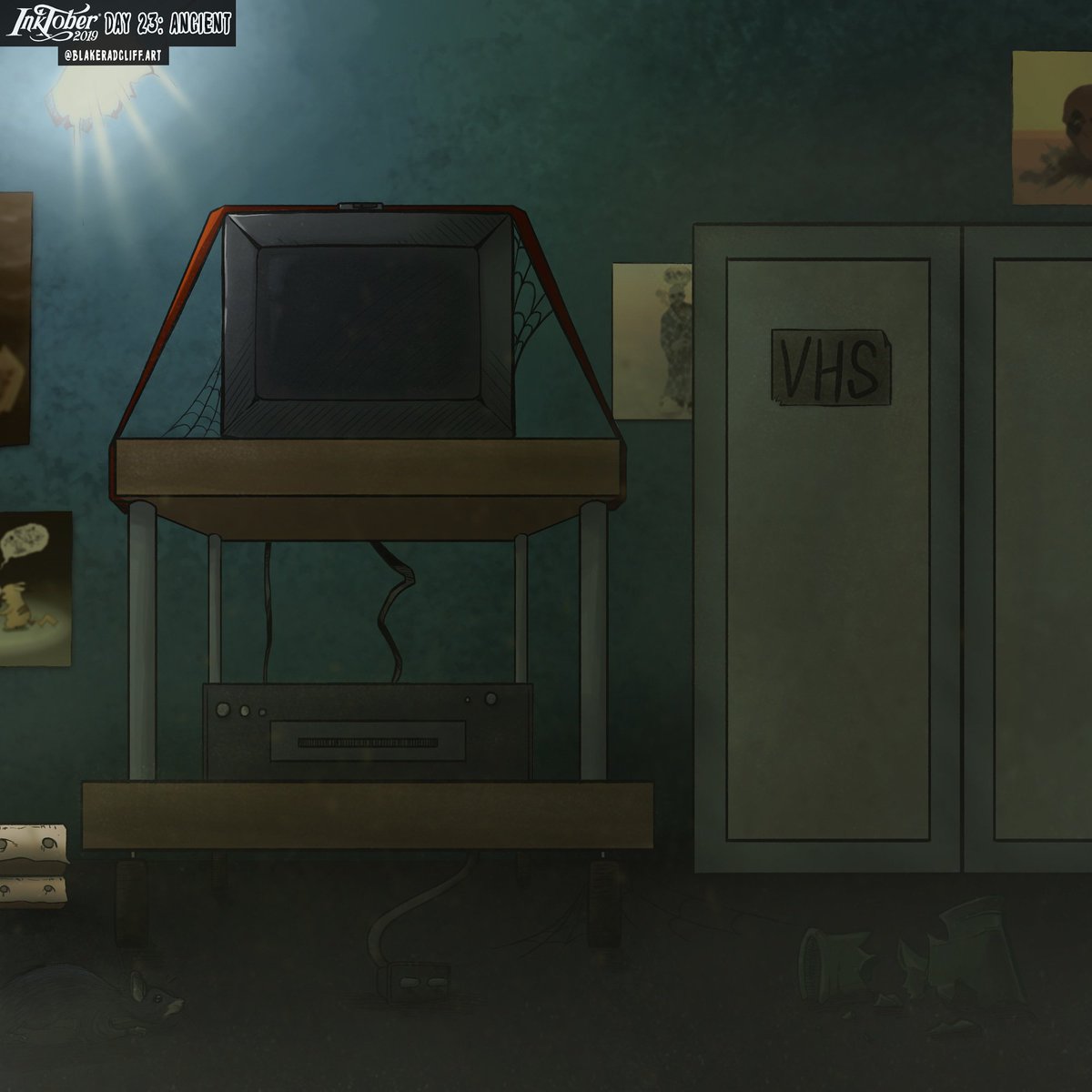 Inktober Day 23: Ancient ✒✒ "The basement of a closed-down school building is filled with long forgotten relics of...the 90's." . . . #inktoberancient #inktober #ancient #art #illustration #artstyle #stillife #vhs #90s #movieposter #90skid #schoolbuilding #painting #artwork