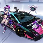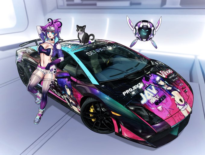 In celebration of @ProjektMelody becoming a racing queen, here is melly leaning against the itasha car made by @SenpaiSquadNet. Also we have our home intruder aka Sugartits. 🙏❤️🐱🥞 🎨: @lavionartz #projektmelodyfanart #VSHOJOART