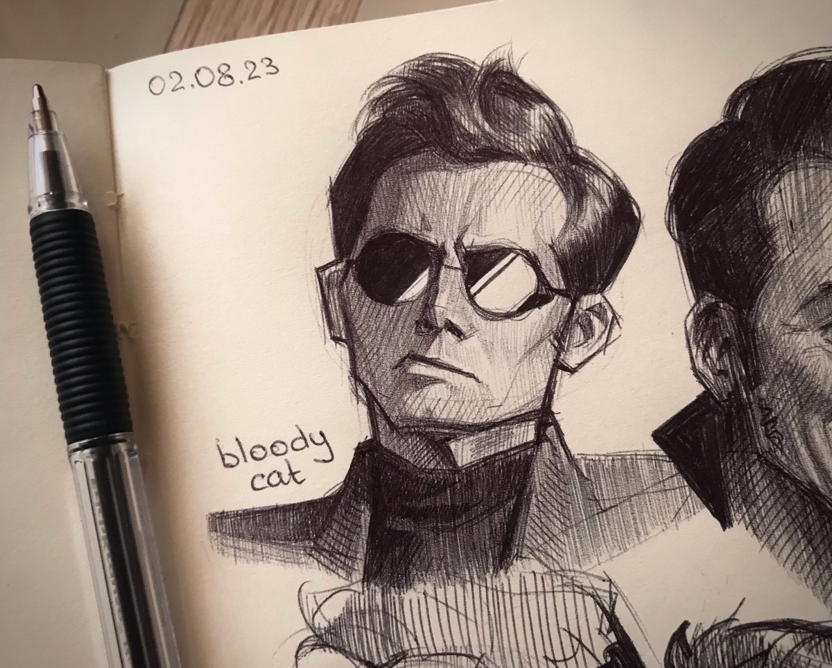 давненько я ручкой кстати не рисовала сегодня посмотрела второй сезон, словила инсульт жопы и села рисовать, потом Азека ещё нарисую #GoodOmens2 #GoodOmens