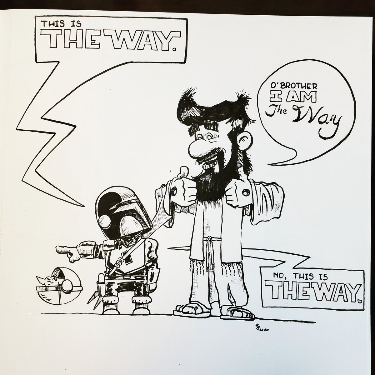 I am rebelling against the #inktober prompt list for a couple of days. I am excited for the return of #starwars the #mandalorian, or as my niece and nephew call it, #raisingbabyyoda. I think even #Jesus would have a hard time talking #theology with a #Mandalorian.