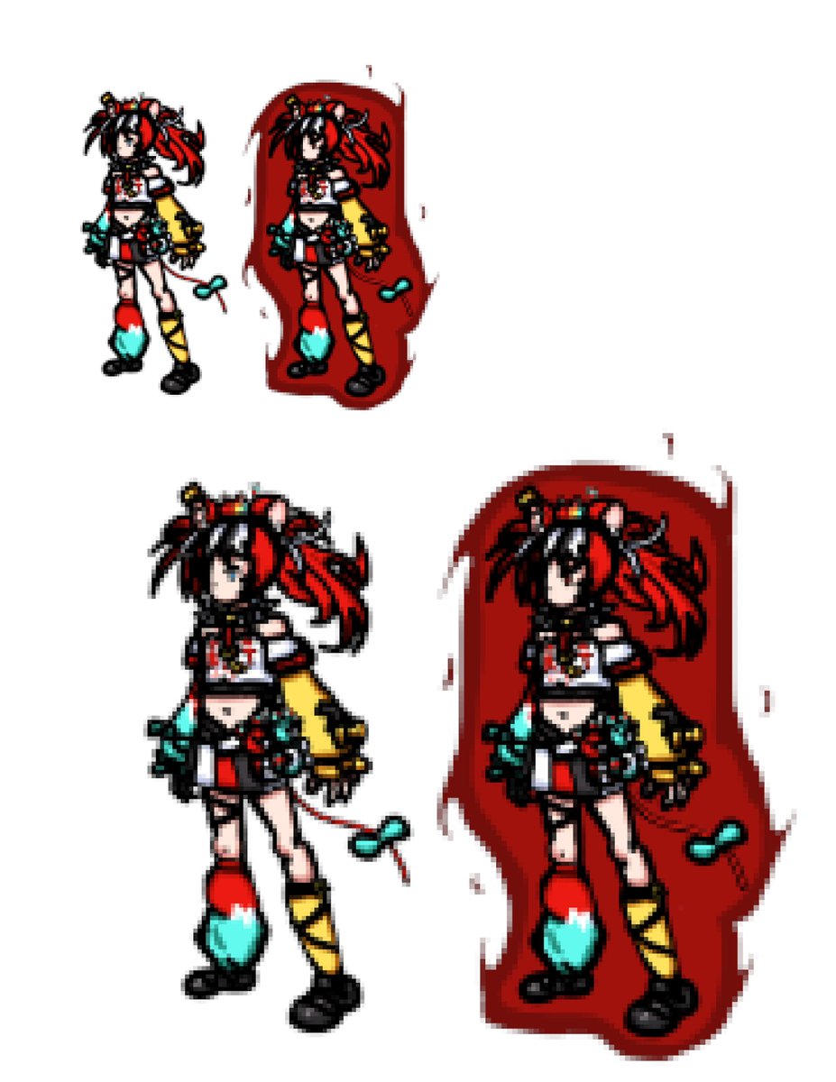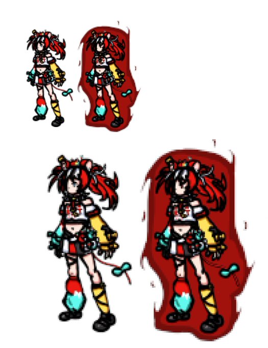 In "Holovania", HoloCouncil's members are the 5 "big" bosses. Hakos Baelz is the last member fought. This is a Photoshop mock-up sprite of Bae and her boss variant. I'll elaborate on her abilities/patterns later on. #illustrayBAE #ベーアート