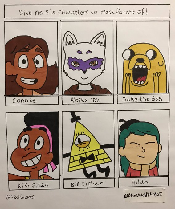 So here is my six characters I did! What do you think? #sixfanarts #connie #alopex #jakethedog #kikipizza #billcipher #hilda #stevenuniverse #idwtmnt #adventuretime #gravityfalls #hildatheseries