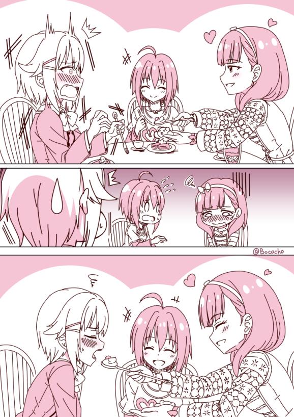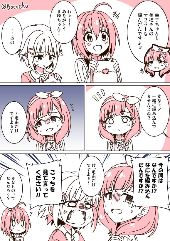 まゆと幸子と美穂とマフラー。Pへのマフラーには何かを編みこもうとしていたけど一体何を…