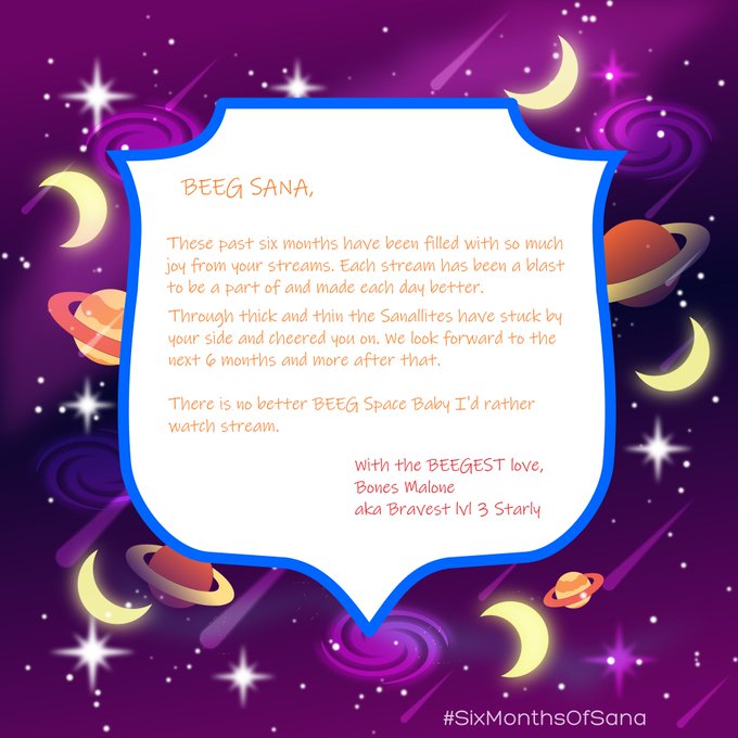Happy 6 months Sanananana!!! Your loving Sanallites are here to flood your art tag with loving words and make you giggle! Thank you for being your weird self and not settling for less than yourself! #SixMonthsOfSana #galaxillust