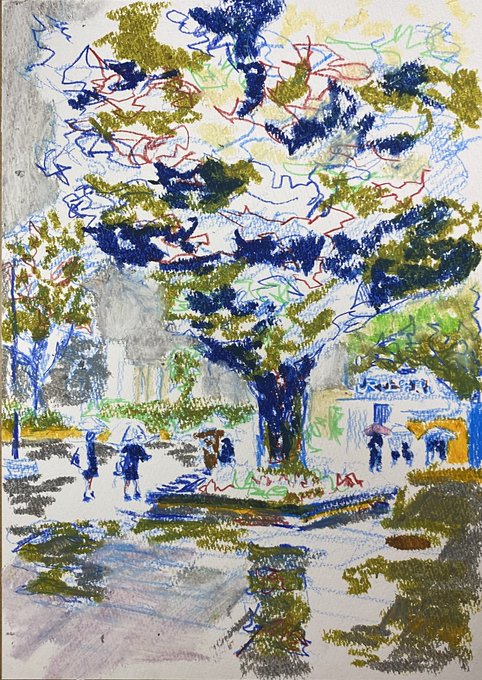 ドローイング 『雨の日の上野駅』 A4画用紙/色鉛筆、オイルパステル #描いてみた #色鉛筆 #ぼん #えーいやぁ