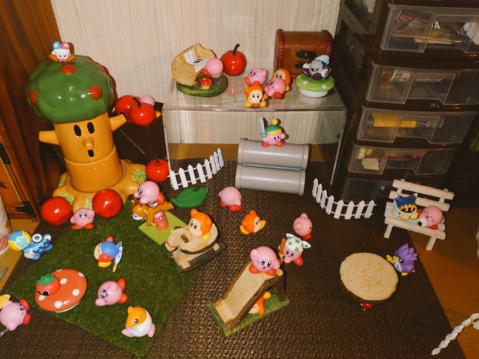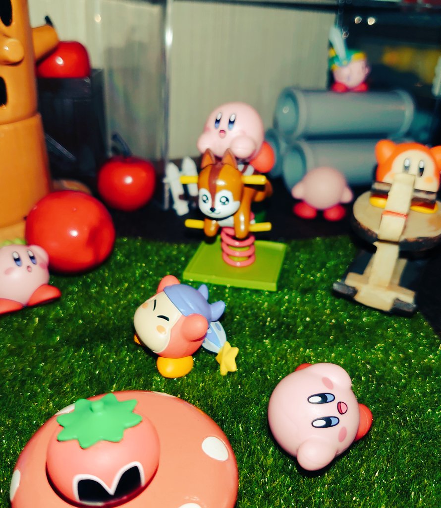 桜が散りましたので模様替え、『ごちゃごちゃ公園』ゆらゆら遊具にカビたん乗せれたのでよかった(o´ω`o) #オモ写 #カービィ