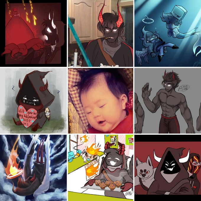 #artvsartist2021 When da baby makes the art Some of the badboyhalo stuff I’ve drawn I feel like I don’t rlly have a consistent way of drawing him for some reason, especially his horns— Top middle is the most recent🥲🥲